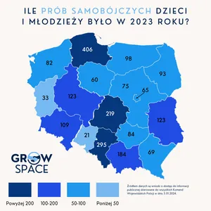 Zgodnie z danymi Fundacji GrowSPACE po raz drugi z rzędu padł niechlubny wzrost prób samobójczych dzieci i młodzieży. W 2023 roku odnotowano ich ponad 2100. To dane zebrane z Wojewódzkich Komend Policji. Aż w 8 województwach pokazują wzrost prób samobójczych dzieci i młodzieży do 18 roku życia. Utrzymuje się także spora liczba przypadków zakończonych tragicznie – to wciąż 146 przypadków. Te dane mogą się jeszcze zmienić.